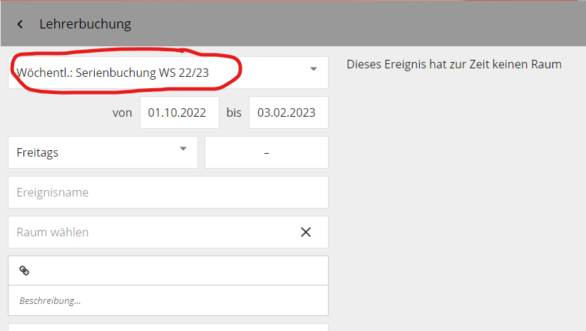 2. Wechseln Sie im Dropdown-Menü von „Einmalig“ zu „Wöchentl.: Serienbuchung WS 22/23“ Sie können den Zeitraum der Serie verkürzen. Alle anderen Terminmerkmale entsprechen denen der bereits bekannten Einzelbuchung.